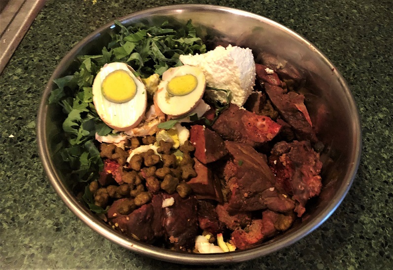 and out as they please and make as a great company. Our dog's daily ration includes: raw meat, kale, eggs, goat cheese and some kibble.