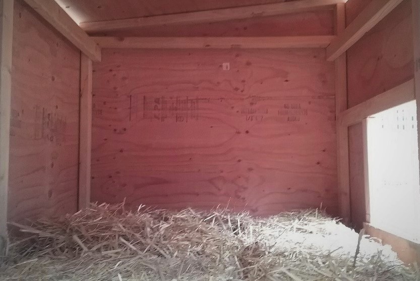 cozy wooden 4 x 6 dog houses bedded on hay, that make our shepherds warm, clean and flea free.